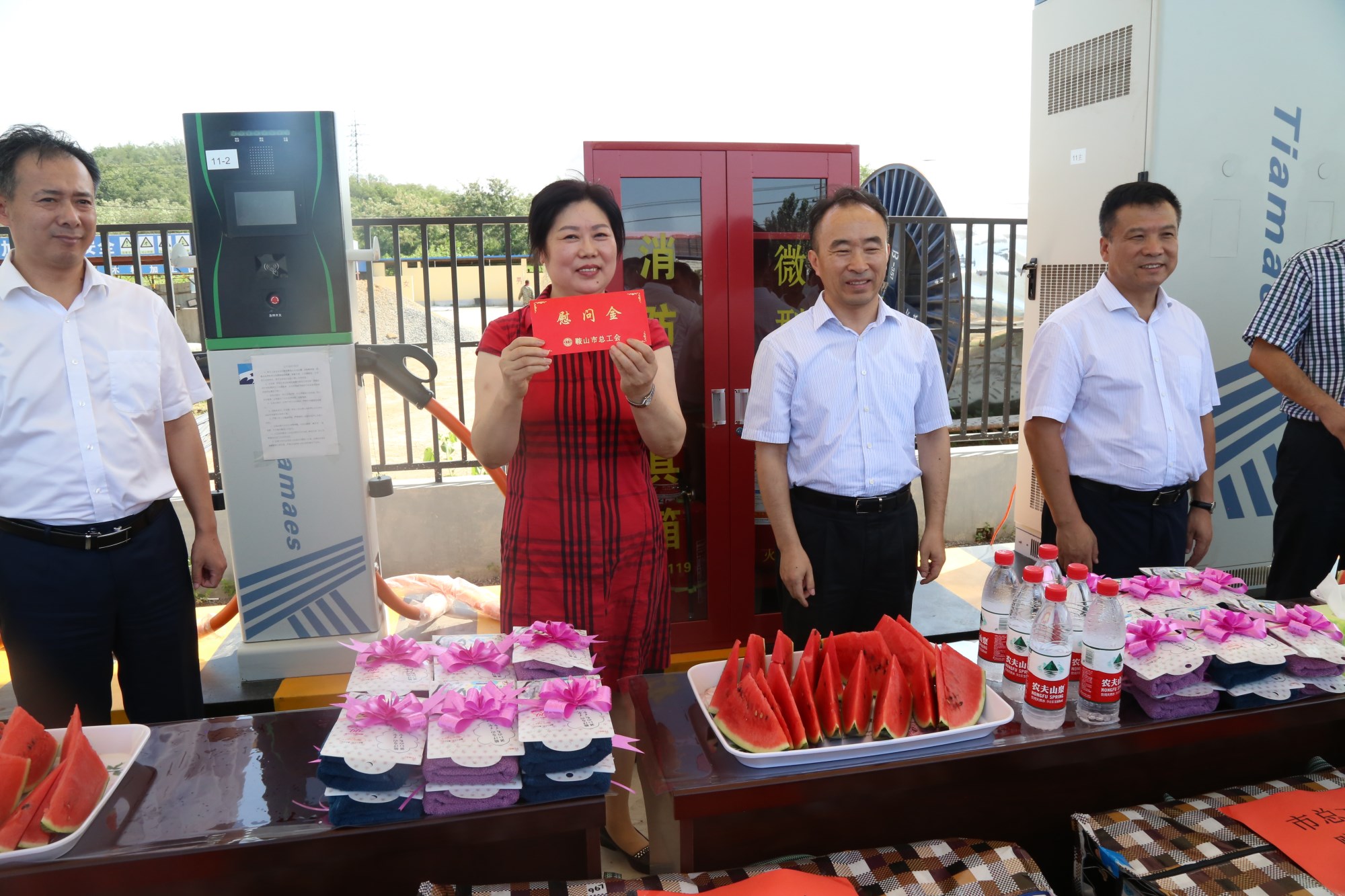 2018年8月1日下午,鞍山市總工會在交運(yùn)集團(tuán)第二汽車分公司216路終點(diǎn)站舉行了為公交一線駕駛員送清涼活動。鞍山市人大常委會副主任、市總工會主席解永孚;市總工會副主席李展程;市國資委黨委書記、主任顧洪新等領(lǐng)導(dǎo)來到216路調(diào)度室看望了交運(yùn)集團(tuán)一線駕駛員,為他們送去夏日里的清涼與工會組織的慰問。交運(yùn)集團(tuán)黨委書記、董事長羅玉艷;總經(jīng)理王春江;黨委副書記、紀(jì)委書記、工會主席金秀石出席了活動;顒又,交運(yùn)集團(tuán)黨委書記、董事長羅玉艷向市總工會領(lǐng)導(dǎo)介紹了企業(yè)生產(chǎn)運(yùn)營情況,并代表集團(tuán)職工向市總工會表示感謝。隨后,市總工會主席解永孚代表市總工會對高溫酷暑中仍堅(jiān)守崗位、辛勤工作的交運(yùn)一線職工致以親切的問候,希望交運(yùn)集團(tuán)廣大職工繼續(xù)發(fā)揚(yáng)艱苦奮斗、愛崗敬業(yè)精神,注意防暑和行車安全,以更好的狀態(tài)投入到工作中服務(wù)好市民乘客,并將市總工會撥付的2萬元慰問金交到交運(yùn)集團(tuán)董事長手中。第二汽車分公司2路線駕駛員謝金紅在活動中代表一線駕駛員作了表態(tài)發(fā)言。最后,各級領(lǐng)導(dǎo)在現(xiàn)場親手將交運(yùn)集團(tuán)工會為一線職工準(zhǔn)備了冰袖、毛巾、西瓜、冰鎮(zhèn)礦泉水等慰問物資發(fā)到職工手中。